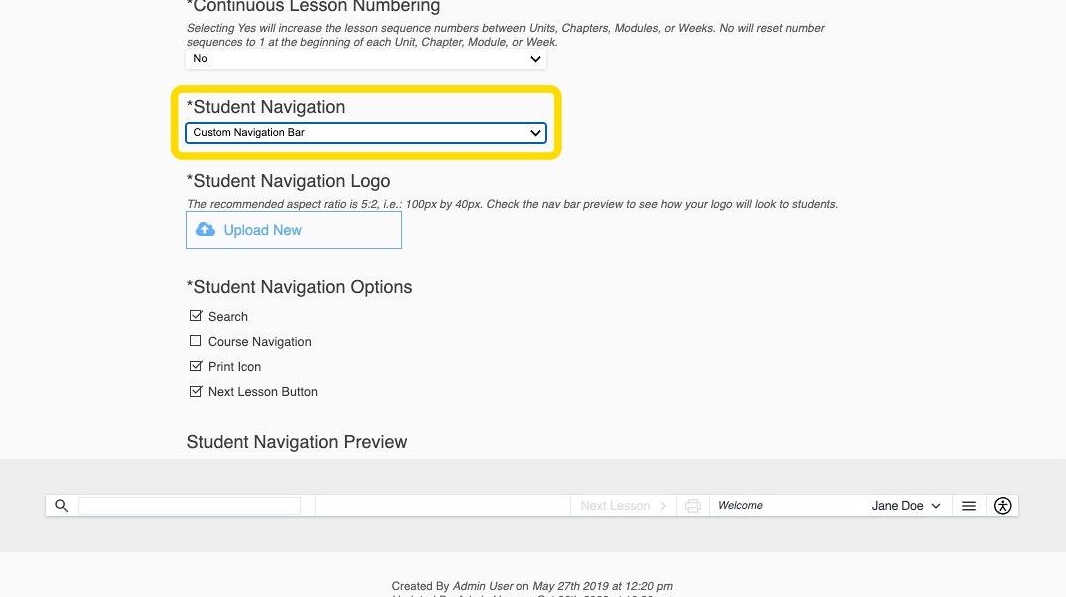 6. You can upload an logo for the student navigation bar by clicking Upload New. Be aware of the recommended aspect ratio of the image.