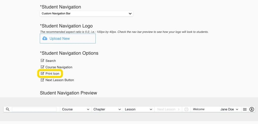 10. You can add/remove the print icon for the student navigation bar by checking/unchecking the Print Icon option.