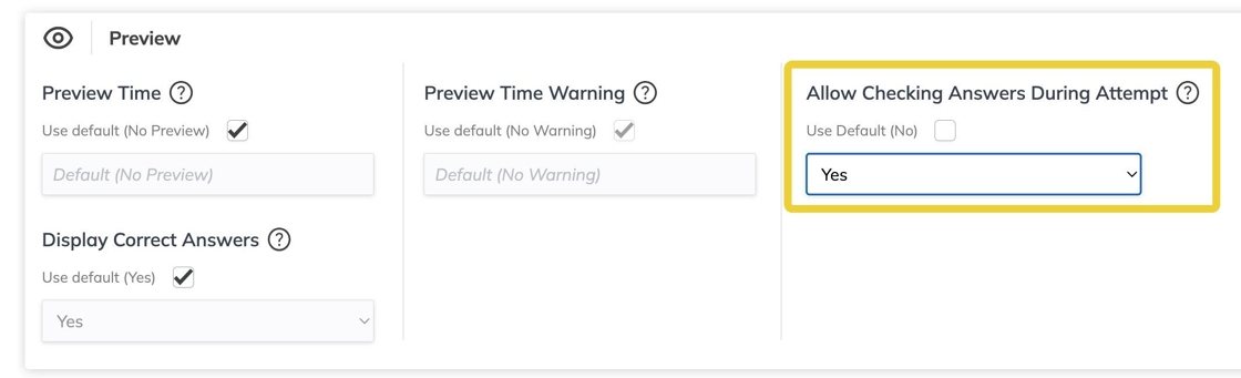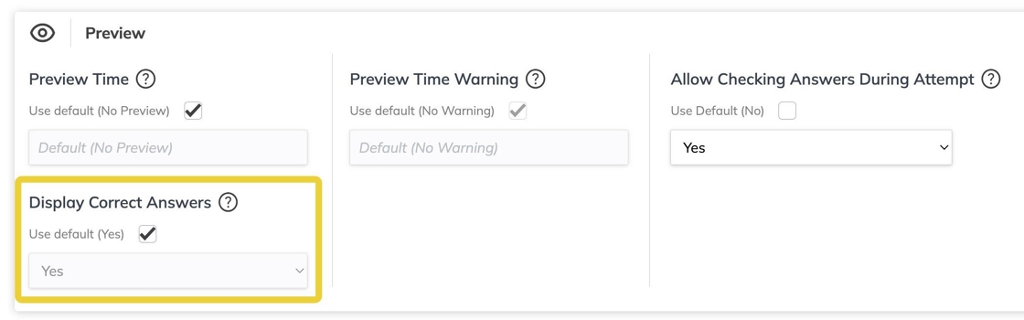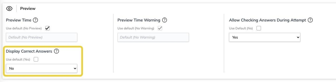 3. To enable, select "Yes" from the dropdown list under the Display Correct Answers section.