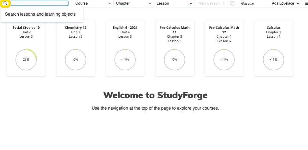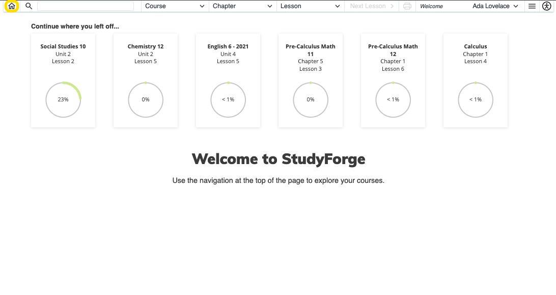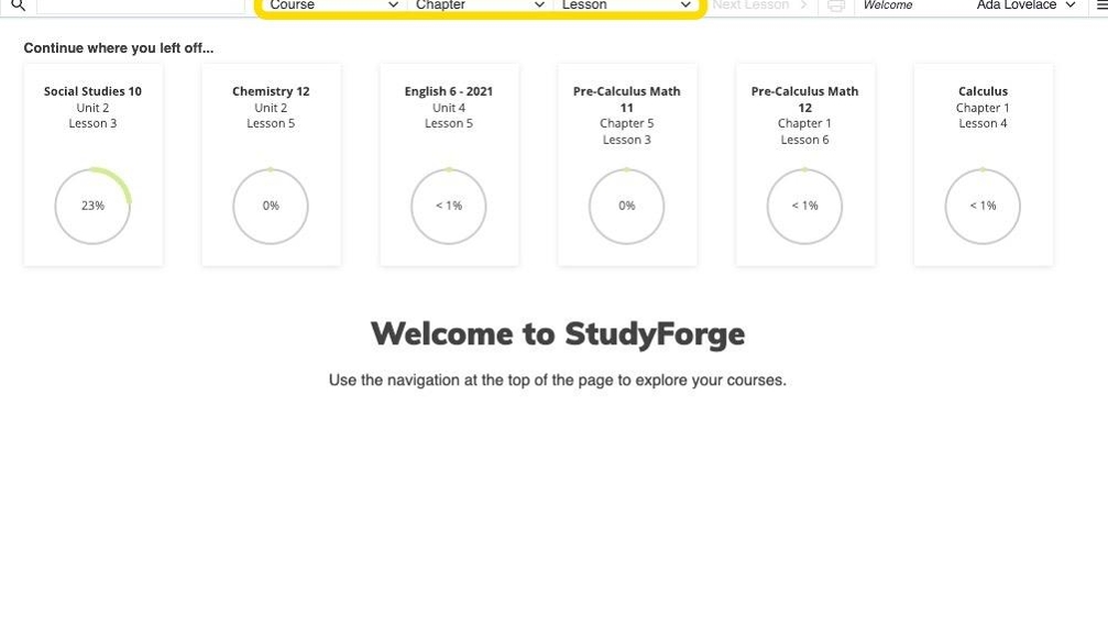 4. Students can navigate through your courses using the navigation controls. Select a Course, Chapter, and Lesson from the lists to navigate to its content.