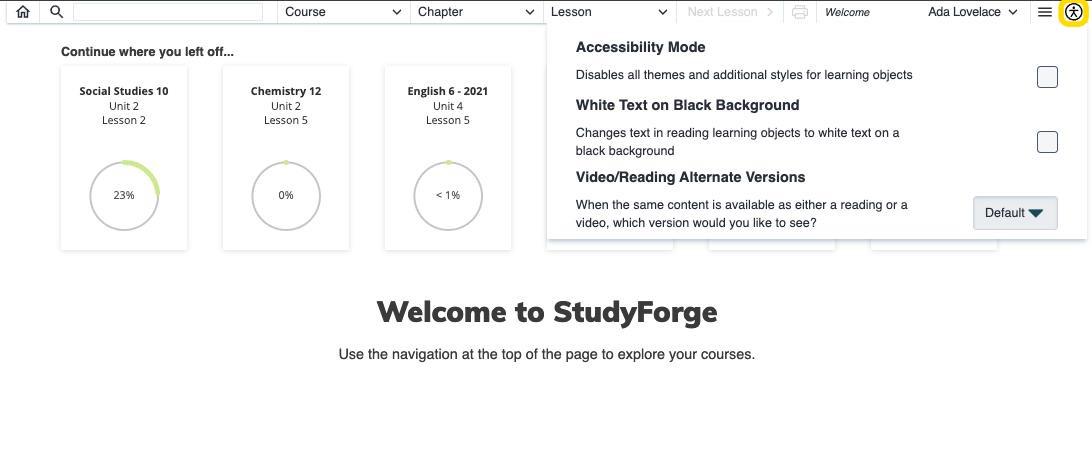 9. Students can click on the accessibility icon to configure the accessibility options.