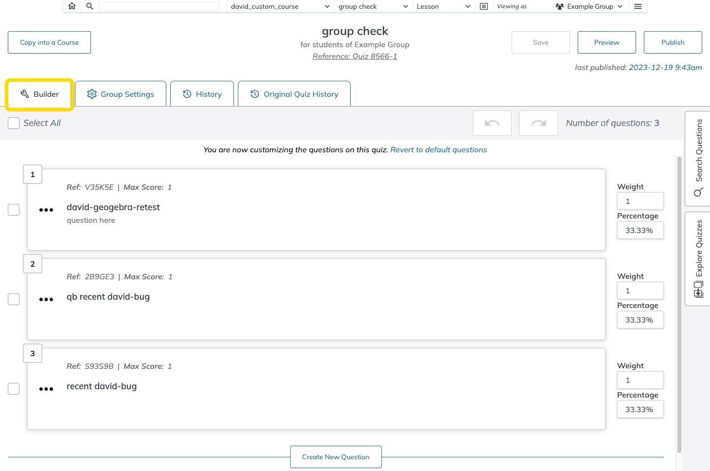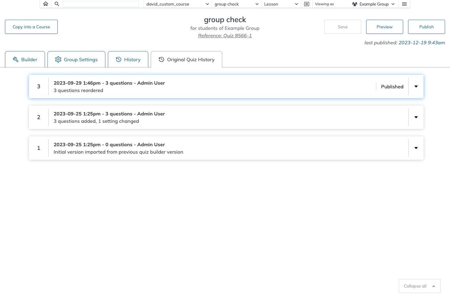 3. To restore to a version of the Publisher quiz, Click Copy Questions to Builder.