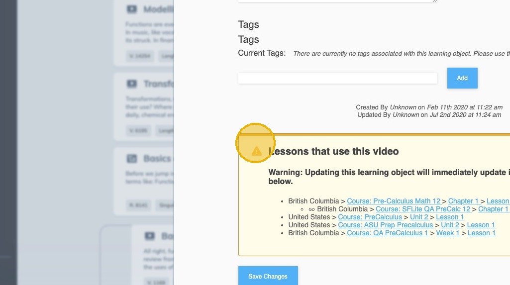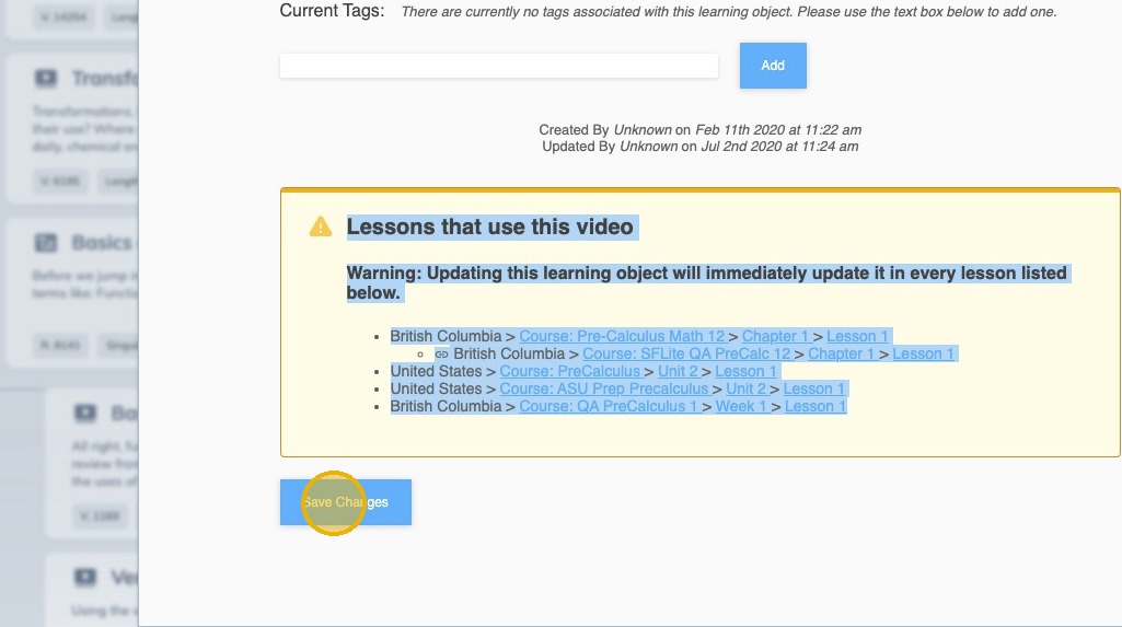Learn how to see which lessons use a learning object before making changes, so you understand what will be affected.